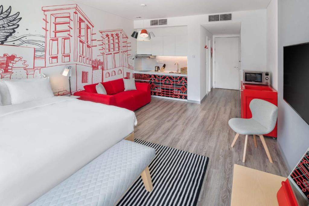 The hotel showcases a trendy and artistic design, reflecting the spirit of innovation and technology in Dubai Silicon Oasis. Radisson RED Hotel Dubai Silicon Oasis features stylish and well-appointed guest rooms and suites, designed to provide a comfortable and engaging stay. Each room is creatively furnished, showcasing modern decor and playful elements.